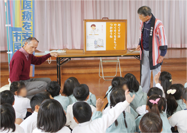 その活動の一環として、命や健康について考えてもらう出前講座を市内8つの認定こども園で行っています。3~5歳の子どもたちに向けた活動のため、当初は子どもたちの集中力が最後まで持たないこともありました。そこで、市民の会は子どもたちが楽しめるような工夫を重ね、読み聞かせではなく、紙芝居を使って子どもたちと会話をしながら、「命の大切さ」や「自分の症状を医師にどう伝えるか」を一緒に考えるようにしました。今では、子どもたちが関心を持ち、積極的に自分の考えを話してくれるほか、親に紙芝居の内容を話すようにもなり、子どもを通して親の医療への関心が高まることも期待されます。