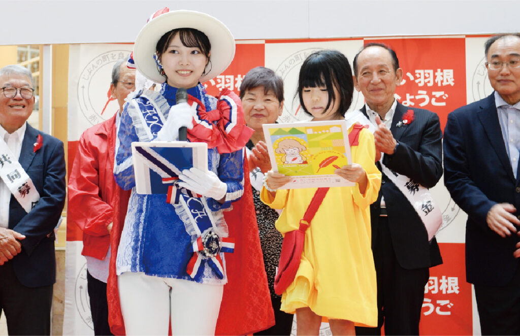 式典では「赤い羽根空の第一便」としてANAの客室乗務員から厚生労働大臣および中央共同募金会会長からのメッセージが伝達された後、宝塚市観光大使 リボンの騎士「サファイア」と、あかはねちゃんに扮した「キッズあかはねちゃん」による共同募金運動の開始宣言が行われました。また、今年度からひょうご赤い羽根サポーターに就任したヴィッセル神戸のクラブマスコット「モーヴィ」も登場し、来賓・参加者と一緒に会場周辺で募金運動への協力を呼び掛けました。