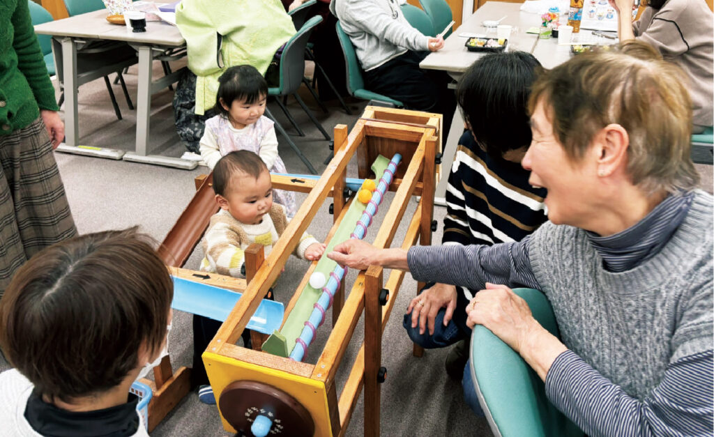 毎月1回開催している三田市の“ほっこり広野”。高齢者だけでなく、子育て中の母親と乳幼児、障害者と事業所職員、近隣の外国人らが参加する多様性豊かな多世代の交流の場です。福祉制度は、高齢者福祉、児童福祉、障害者福祉と縦割りとなりがちですが、自分たちの地域に見合った形で多世代が集う場に作り替えています。ここでは、お茶を飲む人もいれば、折り紙・手芸・囲碁・将棋など自分がしたいことに参加する人もいます。また、乳幼児の遊び相手や母親の話し相手、障害のある人との交流などの楽しみや役割も生まれています。同じ時間にフードドライブも実施しており、食品の寄付に訪れた人をおしゃべりの場に誘うなど、新たな参加者が増えるような工夫をしながら取り組んでいます。