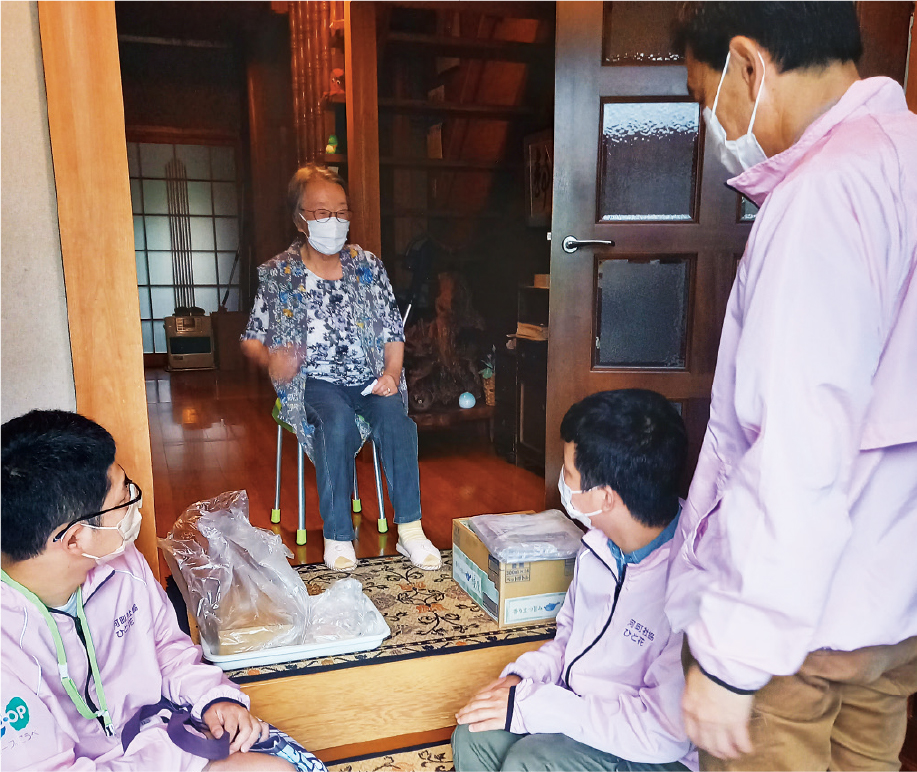 神河町社協が運営する多機能型事業所ひと花は、コープこうべと連携し、買い物困難者を支援する「見守り個配サービス」(週1回)を実施しています。これは、障害のある方が、高齢者宅に注文された商品を配達する取り組みです。訪問の際にゆっくりと談笑する時間をとっている点が特徴です。毎週の訪問を楽しみにして玄関口で待っている高齢者も少なくありません。介護が必要なひとり暮らしの方の利用も増え、今では高齢者の在宅生活を支える重要な取り組みです。